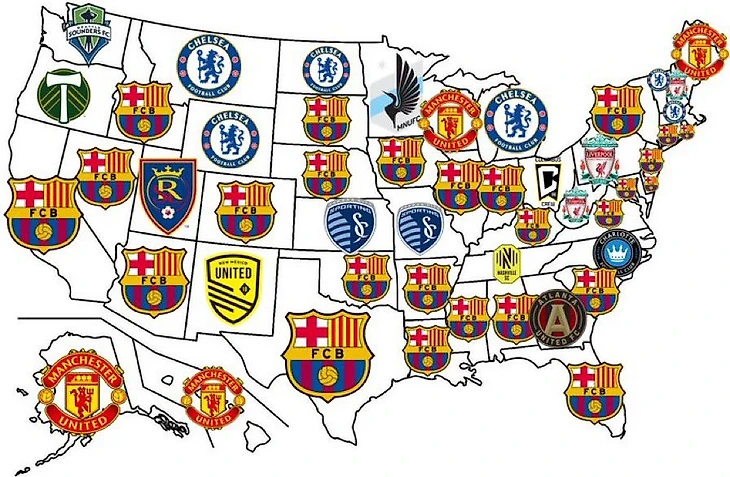 За американские клубы больше всего болеют в 11 штатах. «Барселоне» отдают предпочтение 26 штатов. 6 за «Челси». 4 за «МЮ» и 3 за «Ливерпуль».