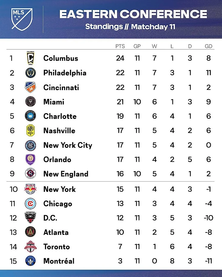 Начнем с восточной конференции. Тот факт, что «Коламбус» лидирует, ничего удивительного, «Крю» регулярно и находятся на верхних строчках в таблице. «Интер Майами» занимает 4-е место, но у них есть матч в запасе, а отставание от первого места на 3 очка – ничего не значат. «Атланта» занимает 13-е место, но при этом отстает от зоны плей-офф лишь на 3 очка, и согласитесь, это очень мало, можно даже сказать, совершенно незначительно. Однако, у «Атланты» просто ничего не получается в последних матчах, они с трудом набирают очки, хоть и считались одними из лидеров, перед началом сезона, благодаря своим покупкам. «Торонто» и «Монреаль» занимают последние строчки и вообще неудивительно, уже не один сезон эти две канадские команды плетутся в подвале таблицы, не могут зареать даже итальянские звезды «Торонто».