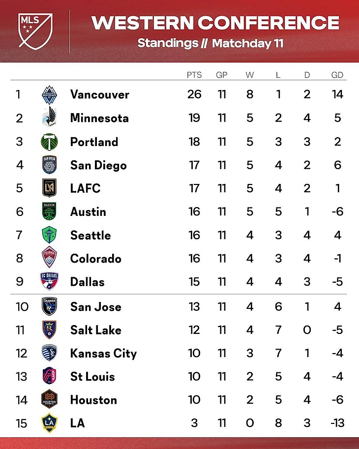 В западной конференции все куда интереснее. Там лидирует «Ванкувер», причем уверенно лидирует, опережая ближайшего соперника на 7 очков, при этом еще достойно выступают в местной Лиге Чемпионов и пробились в финал турнира. «Сиэтл» неплохо усилился на внутреннем рынке, но при этом все равно занимает 7-е место в таблице. «Сан Дего», как новичок МЛС, вполне неплохо выступает, идет на 4-м месте. «Лос Анджелес» уже априори является лидером МЛС, но в этом сезоне дела у них идут средне, не ужасно, но точно могли бы играть и лучше. Худшая итуация в лиге у «Лос Анджелес Гэлакси», действующие чемпионы МЛС за 11 туров 0 раз выиграли и 8 раз проиграли и имеют 3 очка в активе, это одтн из худших стартов сезона в МЛС.