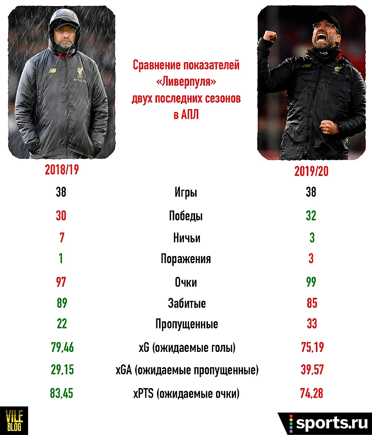 Невероятно, но факт: по ожидаемы голам (забитым и пропущенным) и очкам «Ливерпуль» в этом сезоне выступил хуже, чем в предыдущем, но при этом сумели одержать больше побед и добыть больше очков.