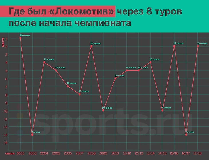 «Локомотив» идет на втором месте, и это праздник какой-то, потому что такого хода в Черкизово не показывали с победного 2002 года — когда после восьми туров команда с 20 очками держалась на первом месте и двигалась к золотому матчу. Сейчас, когда ЦСКА живет без трансферов, а «Спартак» приходит в себя после чемпионского сезона, только «Локо» (19 очков) активно преследует «Зенит» (20 очков) и подтягивает за собой «Ростов», «Краснодар» и «Рубин».