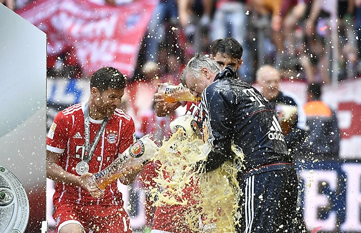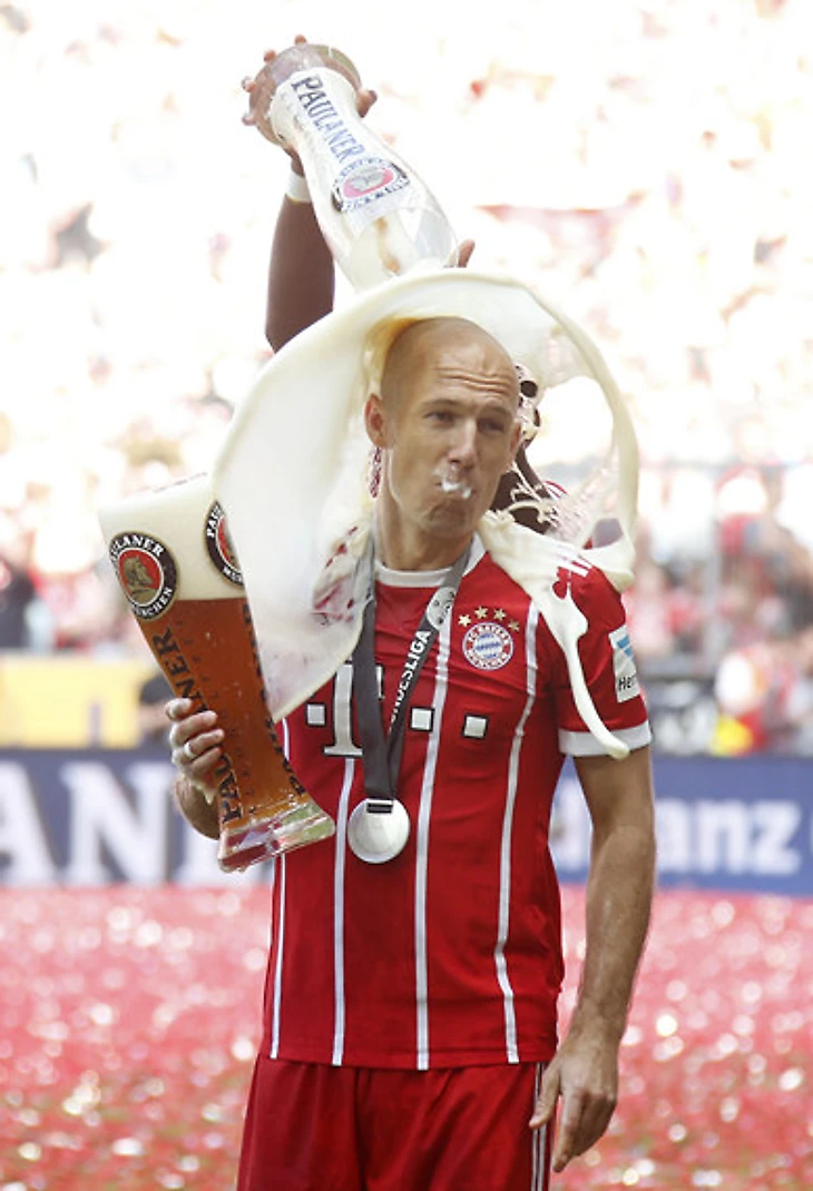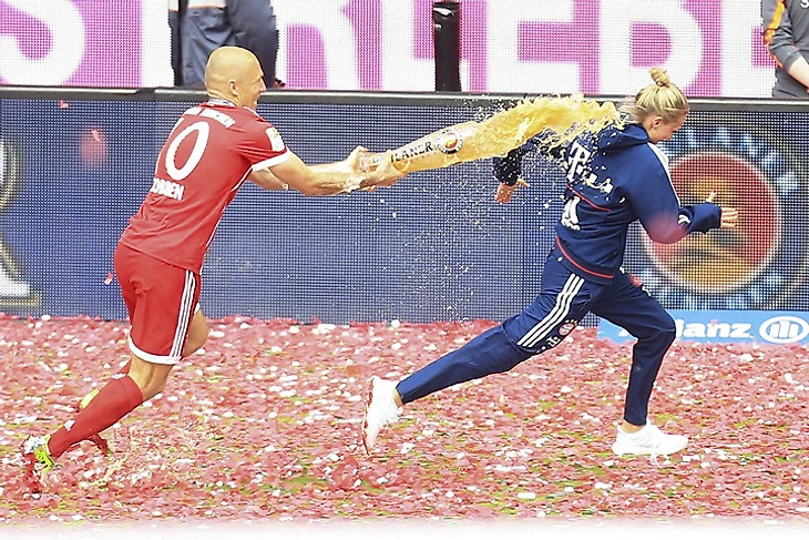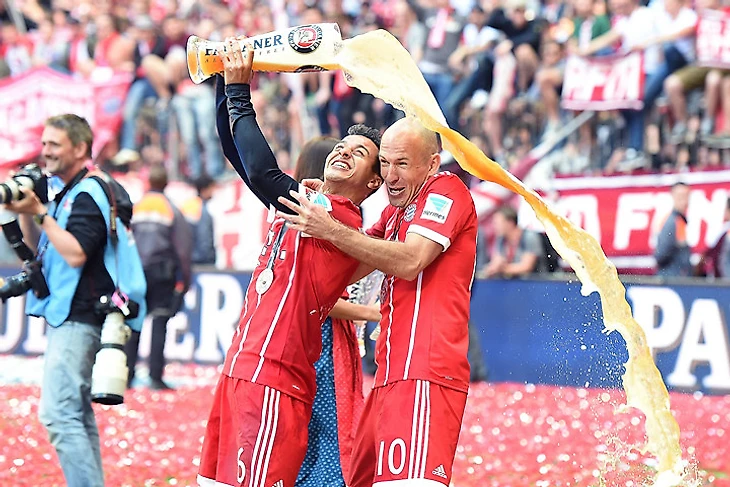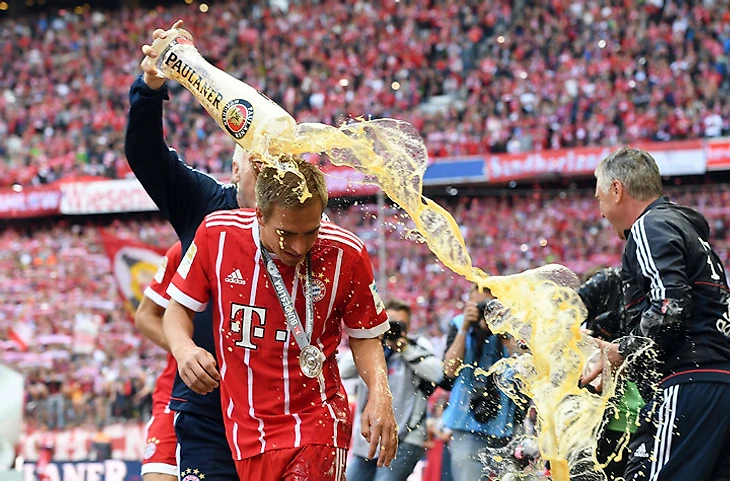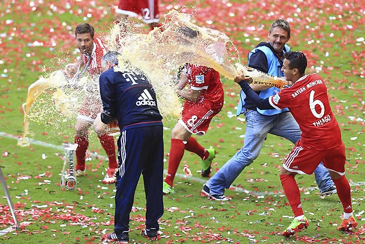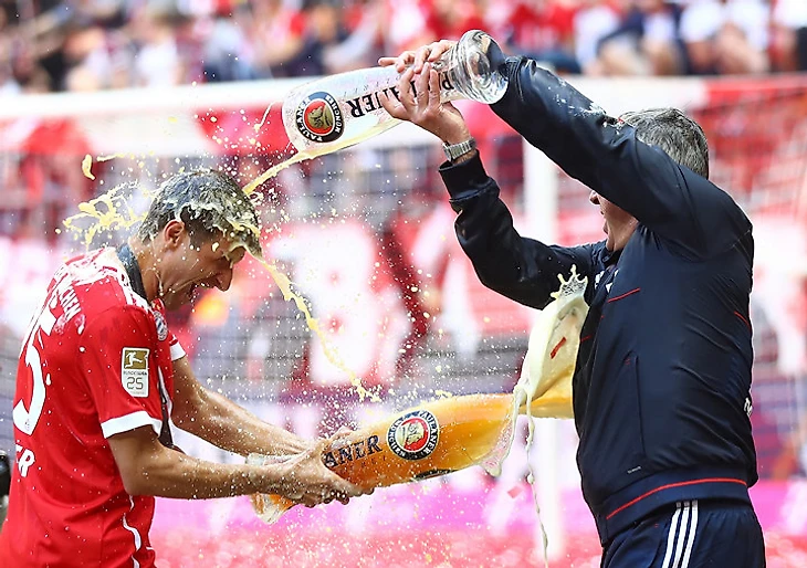 После матча последнего тура бундеслиги «Бавария» не только грустила из-за ухода Филиппа Лама и Хаби Алонсо, но и веселилась благодаря традиционному пивному душу.