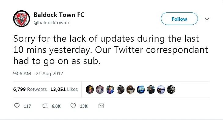 Клуб со дна англ.футбола «Болдок Таун»: «Извините за отсутствие обновлений в последние 10 минут. Нашему Твиттер-корреспонденту пришлось выйти на замену»