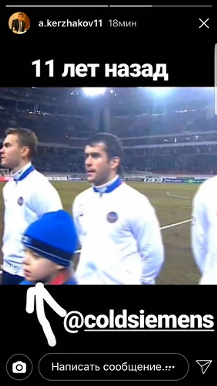В среду в инстаграм-сторис Кержаков выложил еще два кадра, уже без Шнурова. И как оказалось, у легенды питерского клуба и молодого исполнителя есть общее прошлое – на второй фотографии видно, что именно Глеб Голубин (имя Фараона в жизни) выводил нападающего сборной на товарищеский матч Россия – Бразилия (1 марта 2006 года).