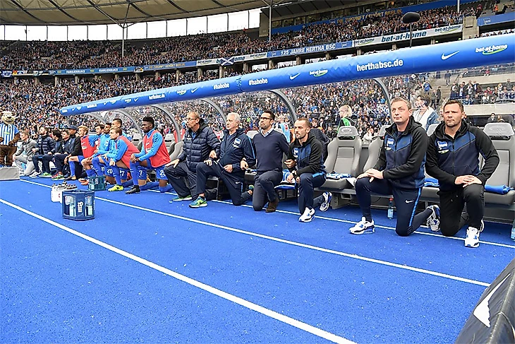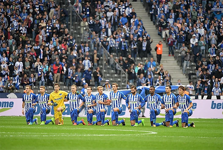 Сегодня перед матчем бундеслиги против «Шальке» футболисты берлинской «Герты» встали на колено. Этот жест пришел из США, где игроки в американский футбол выражают таким образом протест против дискриминации. В Штатах игроки часто протестуют во время гимна, в бундеслиге гимн перед матчами не играют.
