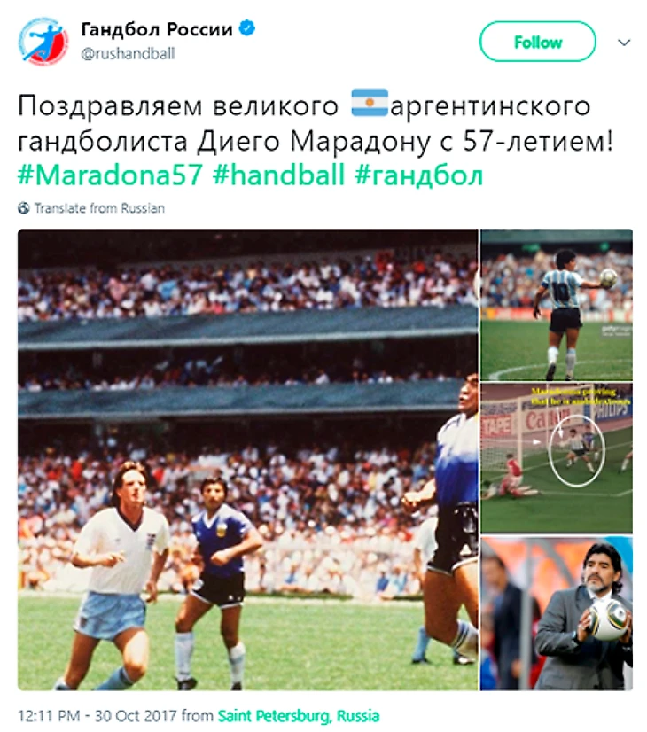 «Поздравляем великого аргентинского гандболиста Диего Марадону с 57-летием!» – написала федерация в твиттере и напомнила о голе рукой и сэйве рукой в матчах против Англии и СССР соответственно.