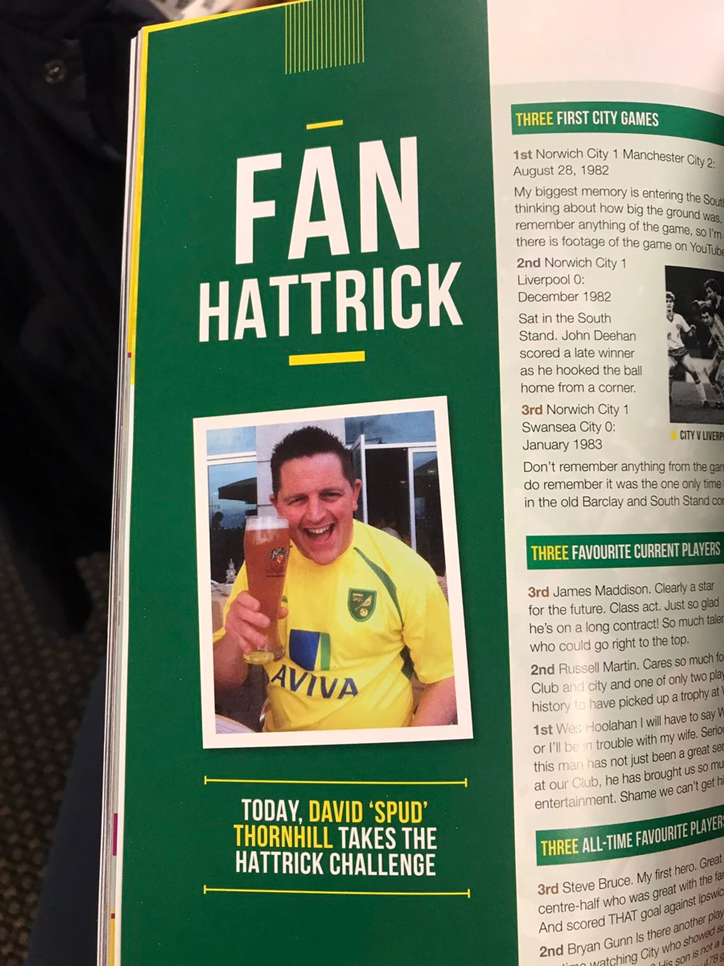 В этот день Дэвиду Торхиллу повезло еще раз. Он попал в предматчевую программку «Норвича» с рассказом о любимых игроках и трех первых матчах на стадионе.