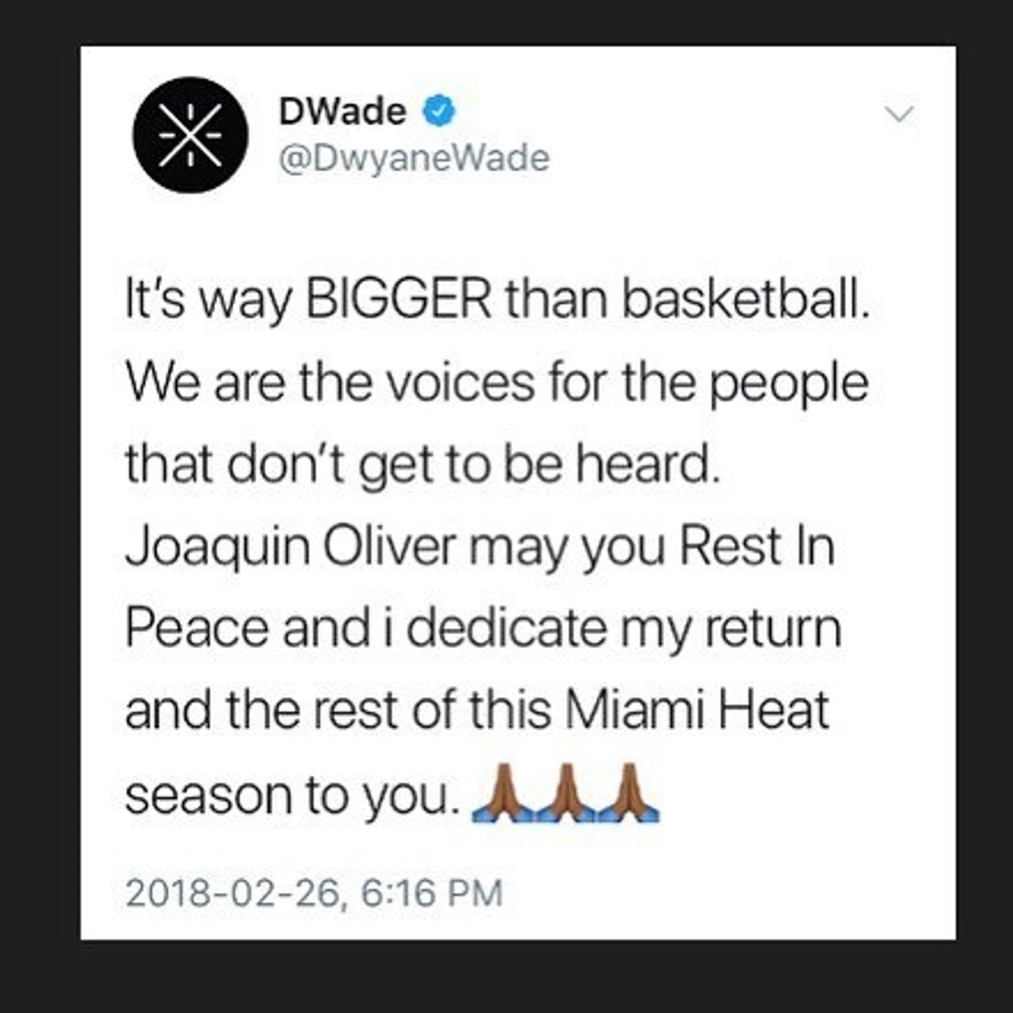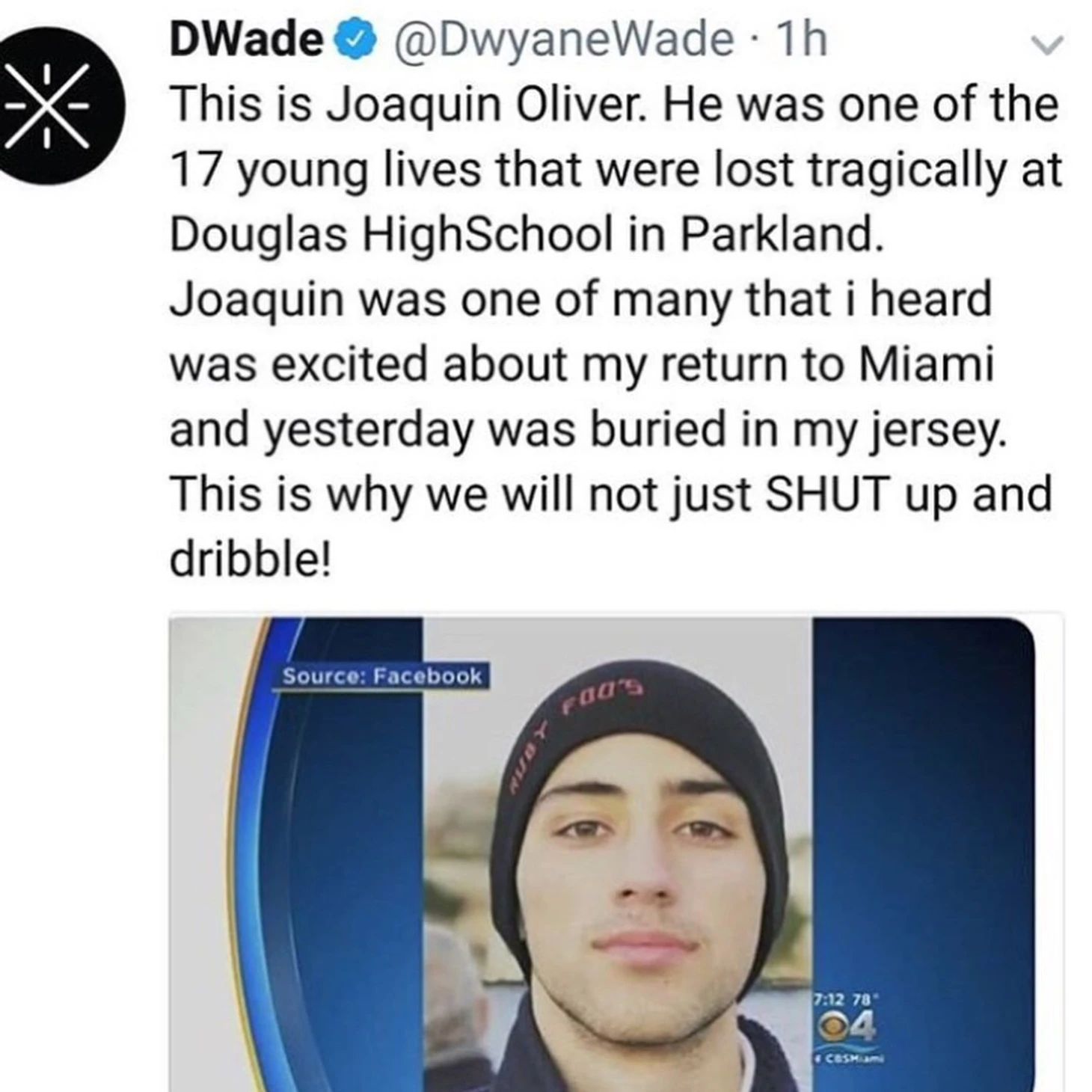 Наверное, каждый из нас слышал про ужасную трагедию в городе Паркленд, штат Флорида, произошедшую 14 февраля. Пару дней назад мир снова заговорил и вспомнил жертв той чудовищной стрельбы. Спустя почти две недели, интернет пространство быстро заполонила весть о том, что один из убитых Хоакин Оливер был похоронен в майке Майами Хит с фамилией Уэйда на спине. Родители Хоакина решились на такой шаг, потому что Хоакин был очень счастлив, когда Дуэйн вернулся в Майами незадолго до трагедии. Девушка и друзья Хоакина также рассказывали о том, что все последнее время Хоакин говорил о Уэйде и мечтал поскорее попасть на домашний матч Майами. К сожалению, Хоакин не успел. В наше время такие вести быстро распространяются и Уэйд отписался в твиттере, что эта новость заставила его плакать. В интервью Уэйд выражал свои соболезнования семье Хоакина и семьям других погибших.