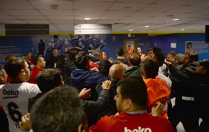В подтрибунном помещении разгорелся новый конфликт. Кто-то напал на помощника главного тренера «Бешикташа». Неизвестно, фанат это был или кто-то из сотрудников «Фенербахче».