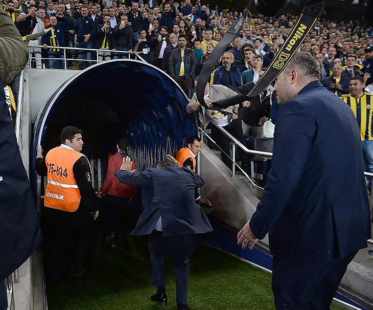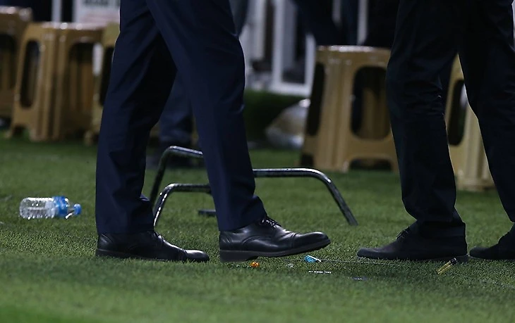 Болельщики «Фенербахче» активно закидывали поле и скамейку запасных «Бешикташа» всякими предметами – от монет и бутылок до зажигалок.