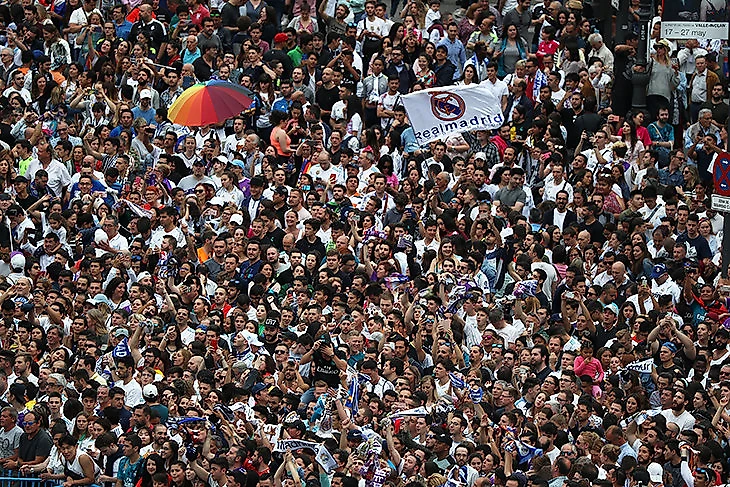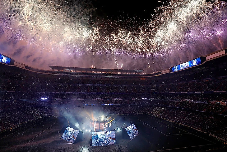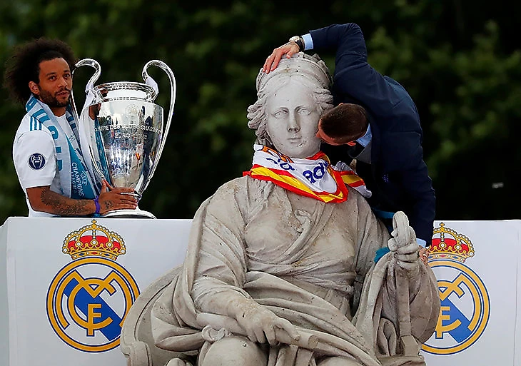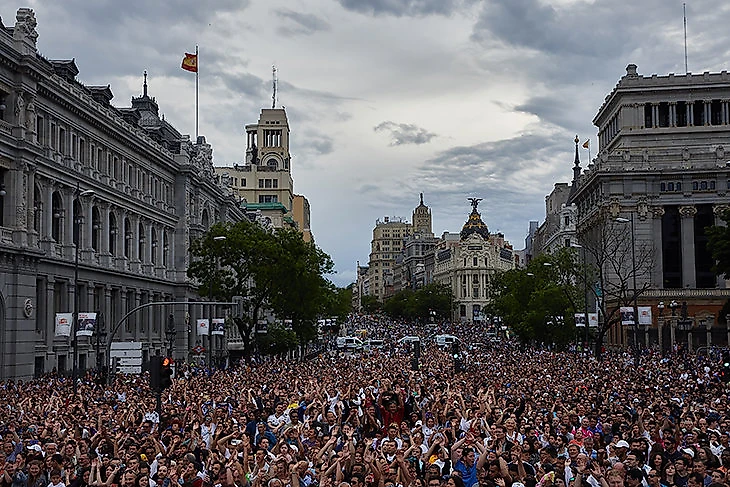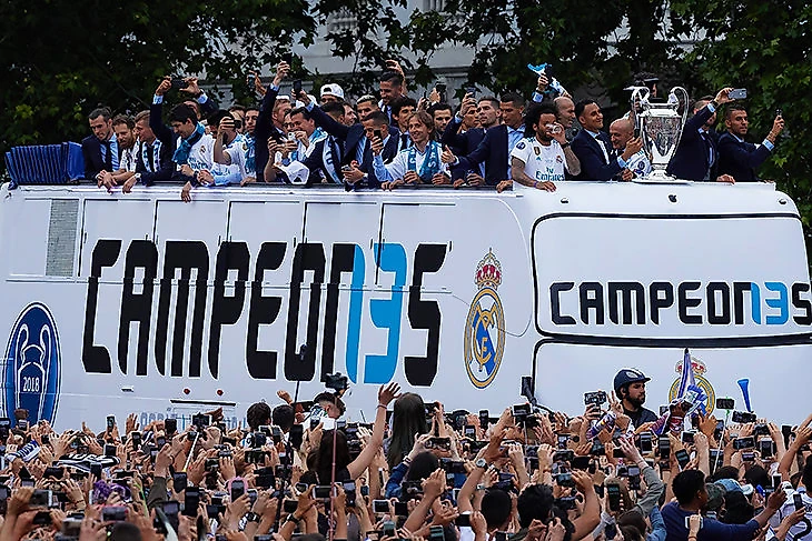 С наступлением темноты торжества переместились на «Сантьяго Бернабеу». Выглядело все еще более эффектно. Вместе с футбольным «Реалом» праздновал баскетбольный, который недавно тоже стал лучшим в Европе.