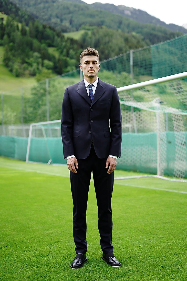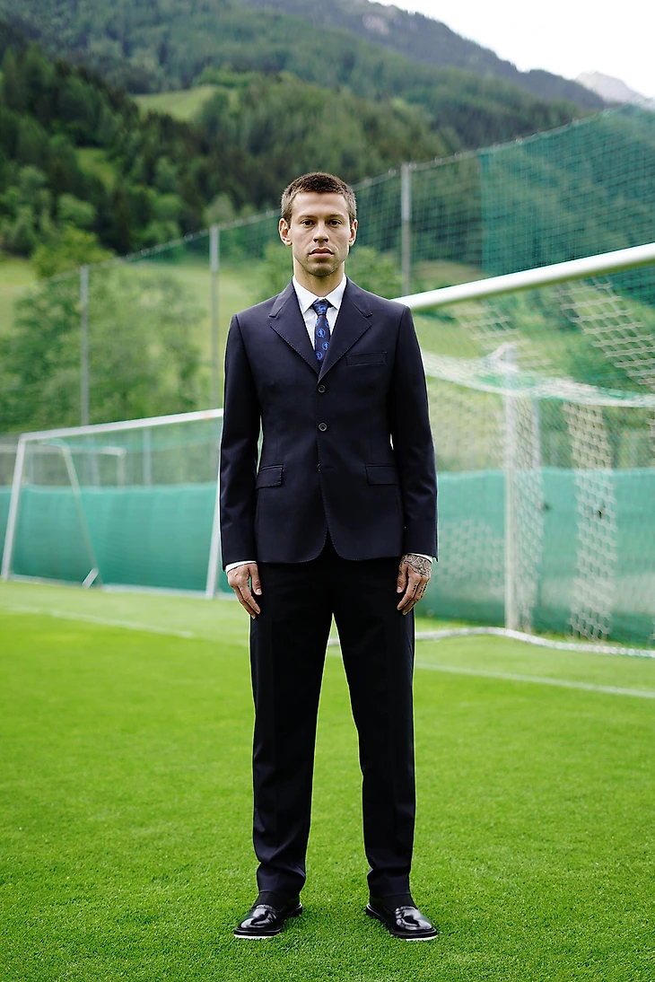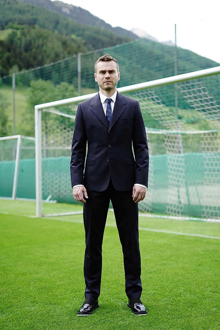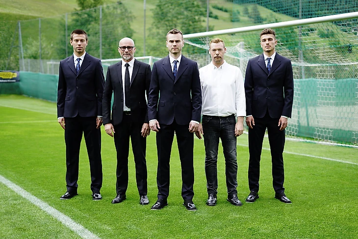 Сборную Россию одели в приталенные пиджаки, белые рубашки, зауженные брюки и галстуки с логотипом бренда. На фотосессию позвали троих футболистов: Федора Смолова, Игоря Акинфеева и Романа Нойштедтера, который не попал в итоговую заявку. Неловко вышло.