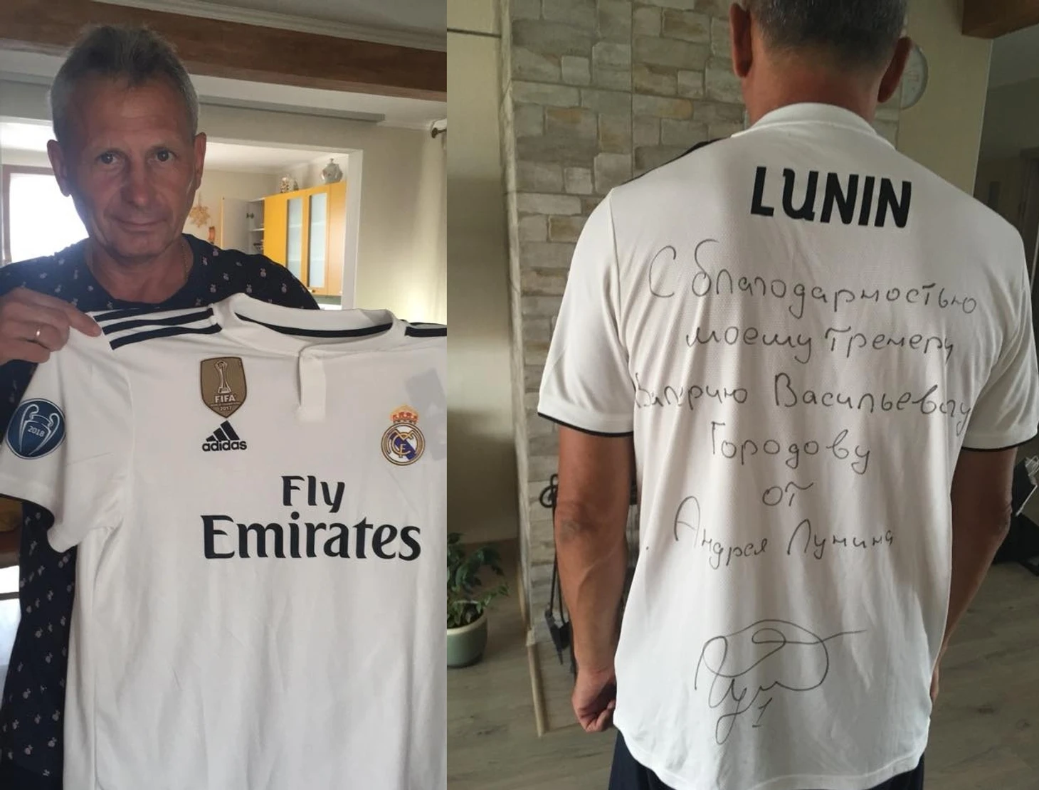 «С благодарностью моему тренеру Валерию Васильевичу Городову от Андрея Лунина», – написал игрок на футболке.