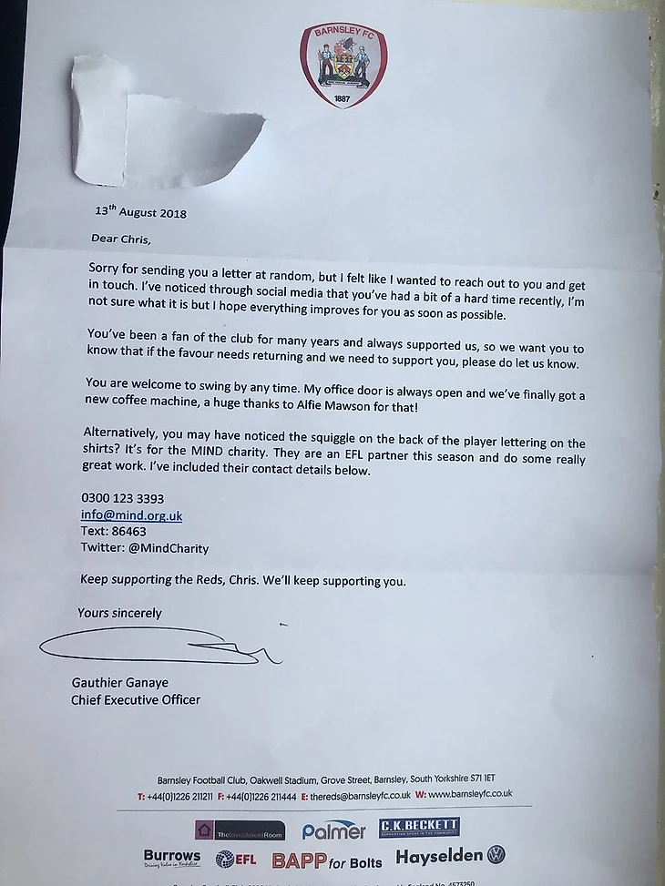 Английская лига 1 сотрудничает с благотворительной организацией Mind, которая помогает жителям Англии и Уэльса. В конце письма Готье оставил контакты Mind, и написал: