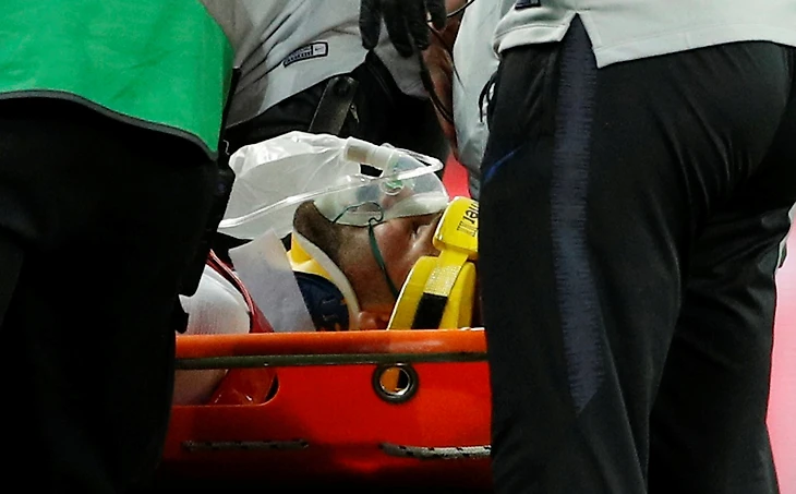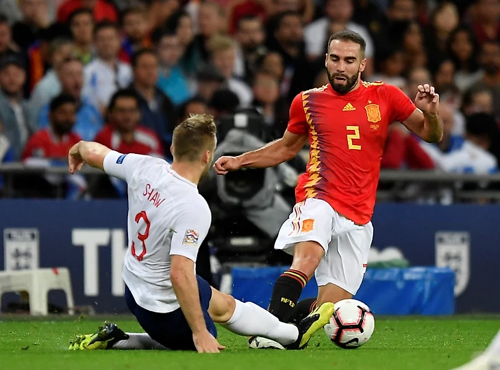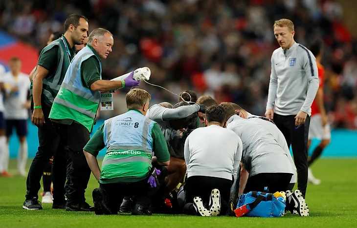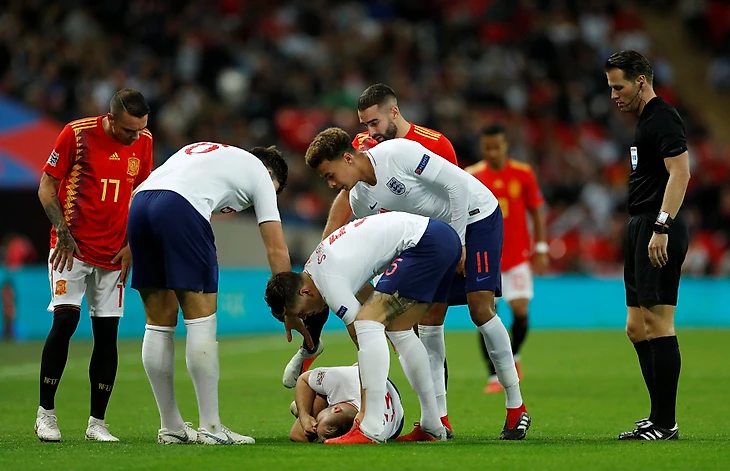 В начале второго тайма матча сборных Англии и Испании Люк Шоу врезался в защитника «Реала» Даниэля Карвахаля. Англичанин приземлился на газон и не смог подняться самостоятельно.