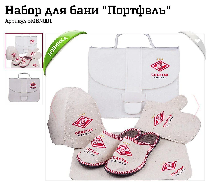 В официальном магазине московского «Спартака» продается банный набор «Портфель». Тапочки, шапка, рукавица и полотенце складываются в портфель для походов в баню.