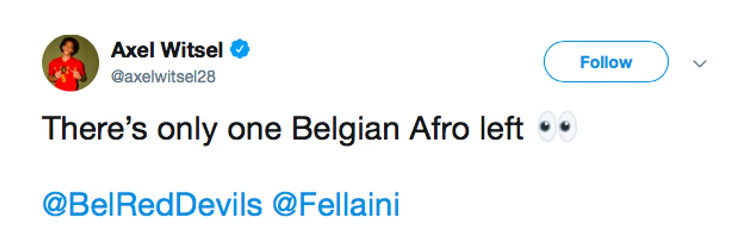 Новая прическа Феллайни – событие! В соцмедиа это обсуждают не только болельщики, но и футболисты. Например, Аксель Витцель написал в твиттере: «Остался только один бельгийский афро».