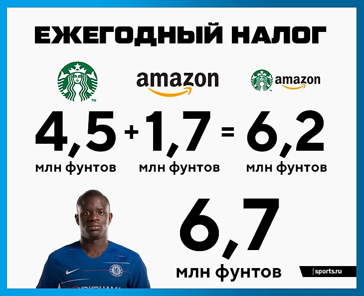 Это больше, чем у Amazon, который выплатил 1,7 млн фунтов налогов в прошлом году (согласно их августовскому отчету) и Starbucks (4,5 млн фунтов). В сумме у гранд-корпораций получается 6,2 млн фунтов в год; и это на 500 тысяч меньше, чем налоги с одного контракта Канте.