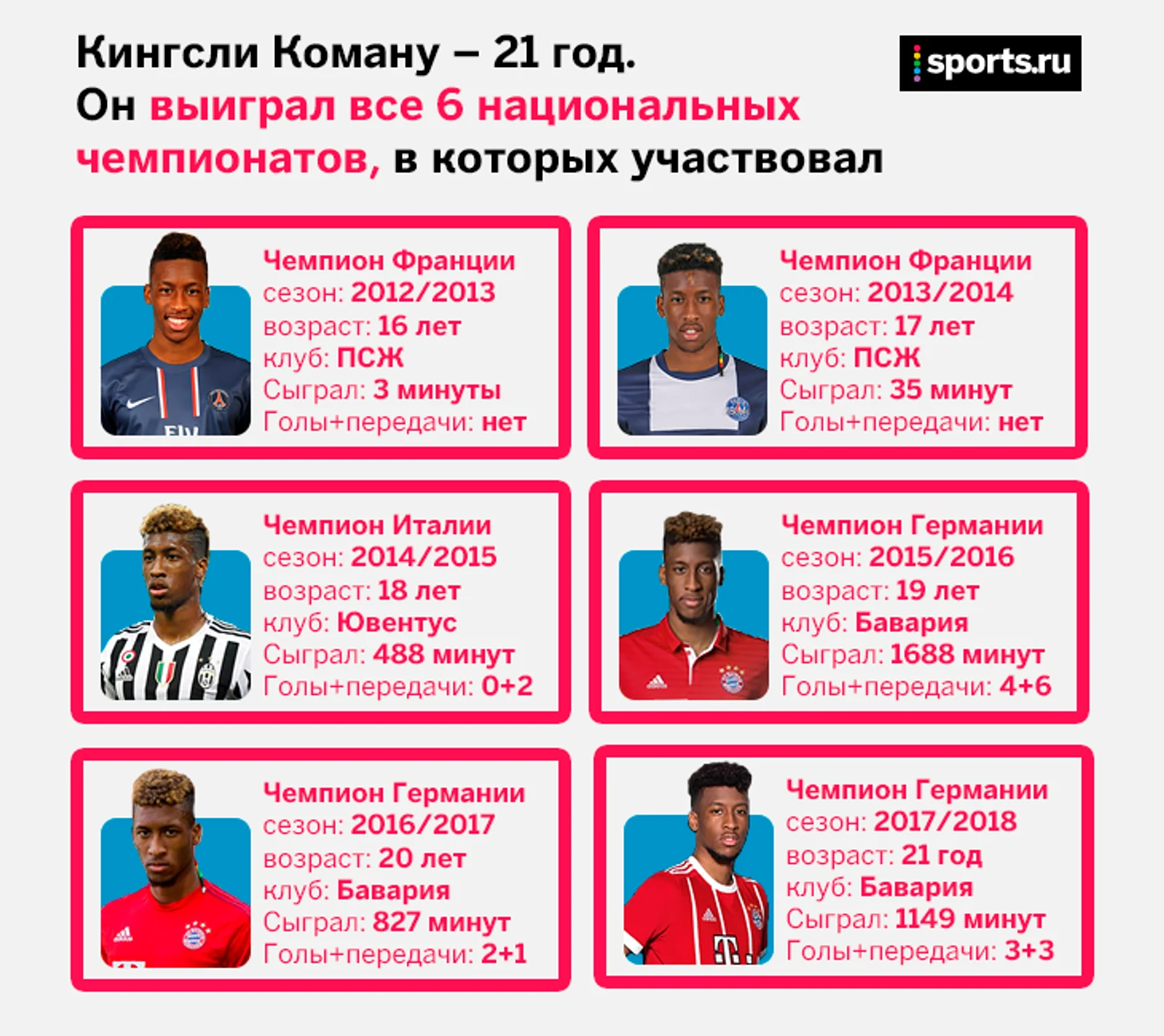 К 22 годам Кингсли Коман выиграл шесть чемпионатов, в которых принимал участие. Первый титул он взял в 16 лет с «ПСЖ» и ежегодно пополнял коллекцию:
