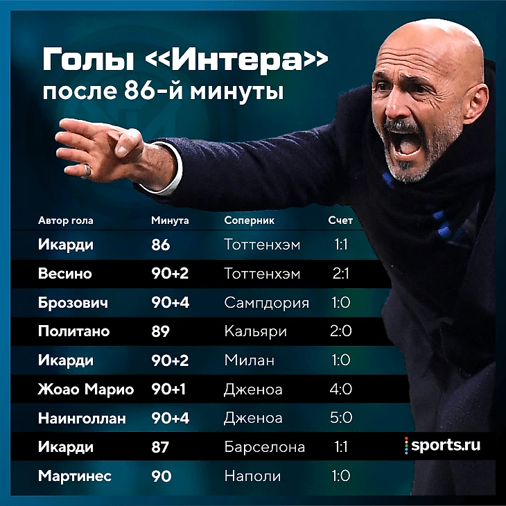 • После 86-й минуты «Интер» забил 9 голов. Всего у команды в серии А и ЛЧ 36 забитых. То есть четверть всех своих мячей «нерадзурри» положили в последние минуты встречи.