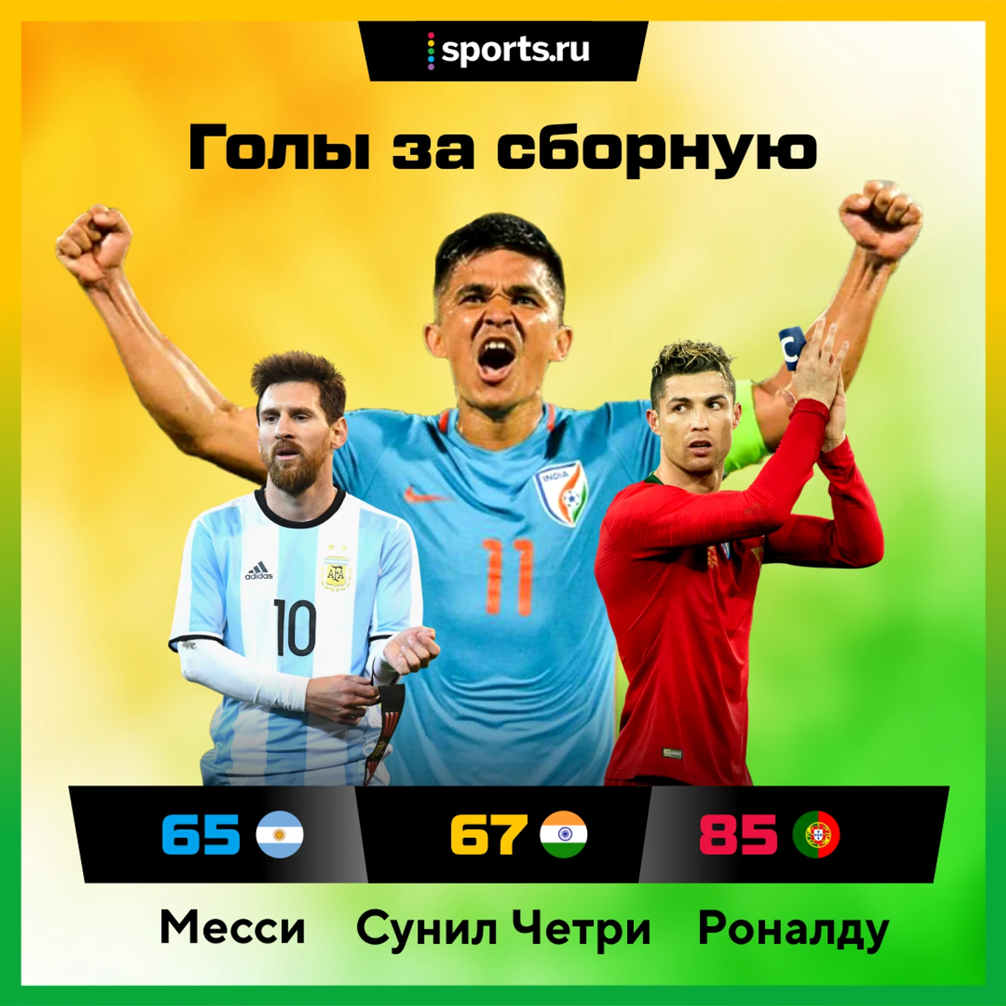 Забив дважды в матче против сборной Таиланда, Сунил Чхетри обогнал Лео Месси в списке лучших бомбардиров в истории сборных. Впереди только Роналду с 85 мячами, у Сунила – 67.