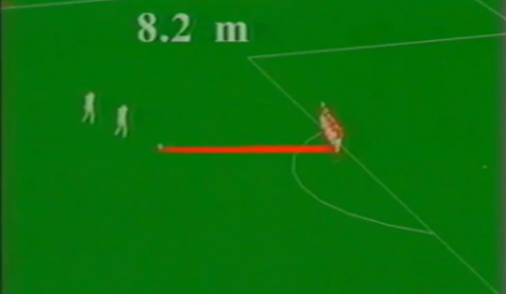 «Стенка, буквально, вот хорошо видно, как неудачно была поставлена стенка. Ну, собственно, не стенка, а такой жиденький заборчик, где были просветы. Если бы наши футболисты посильнее ударили, то, это вот расстояние до стенки (8,2 метра).