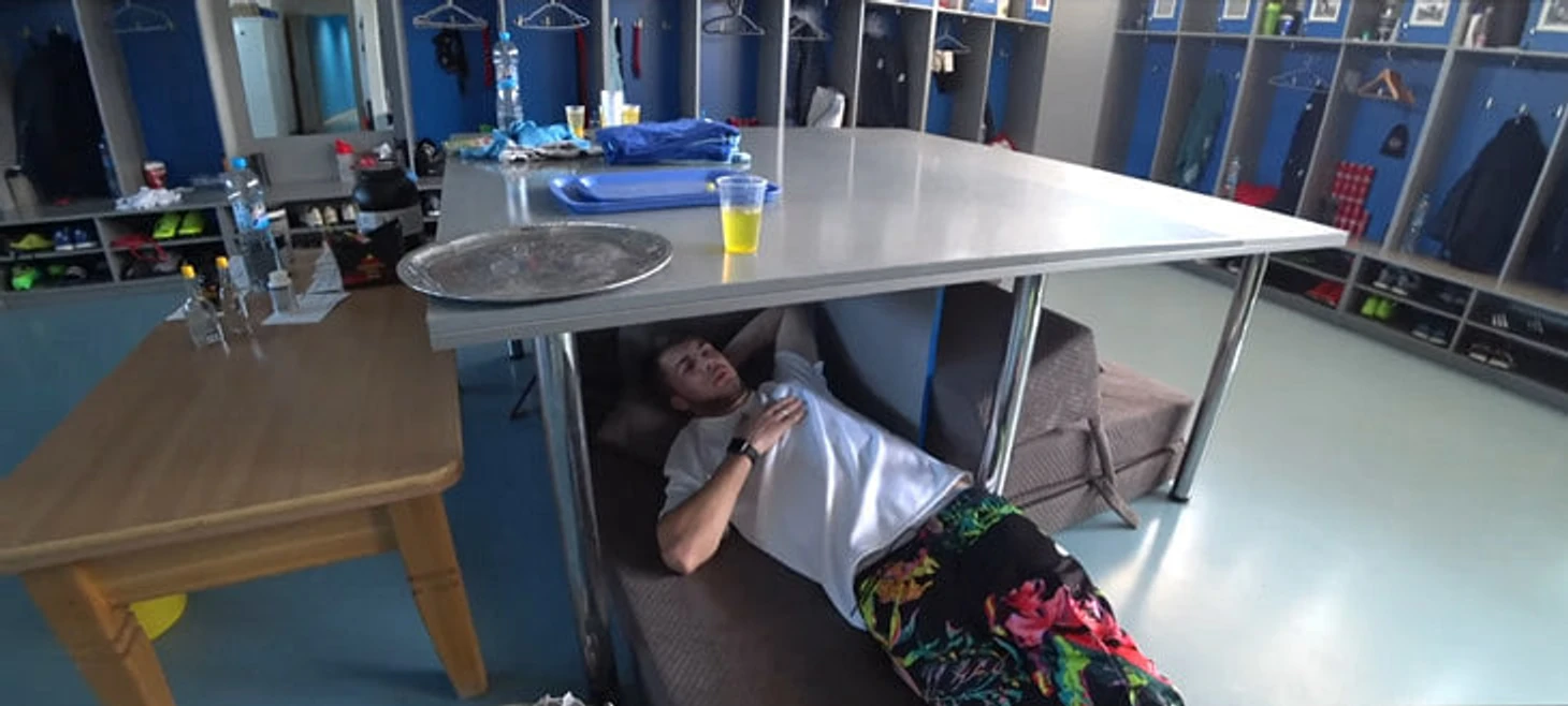 Какие-то ребята отдыхают после предигровой тренировки прямо в раздевалке. У Комличенко под столом спрятан матрас, который легко раскладывается в удобную лежанку.