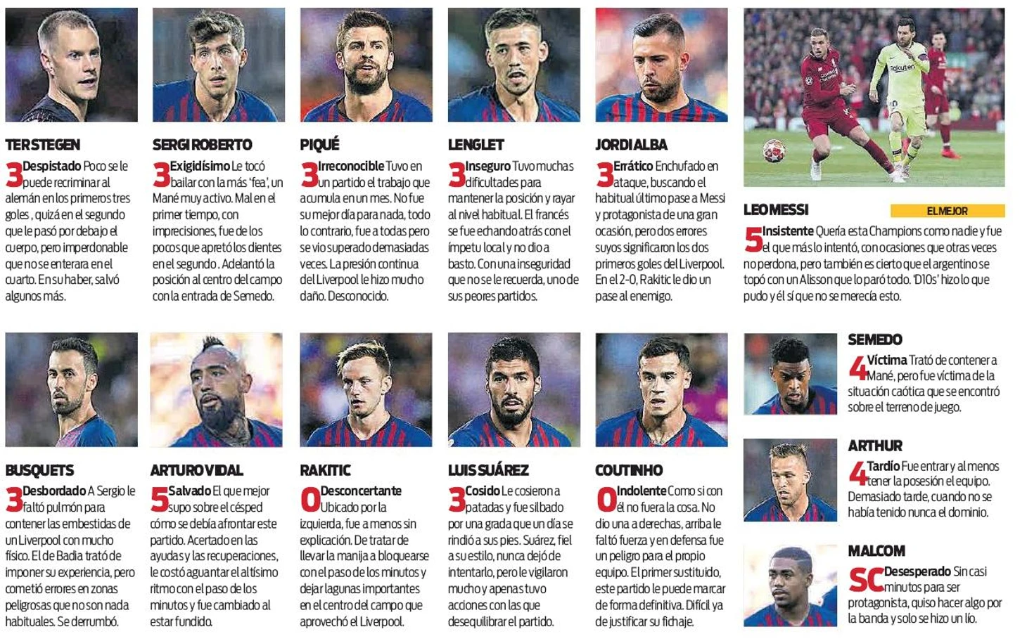 Каталонская газета Sport после поражения «Барселоны» от «Ливерпуля» в ответном матче 1/2 финала Лиги чемпионов (0:4, 3:4 по сумме двух встреч) поставила свои оценки игрокам команды.