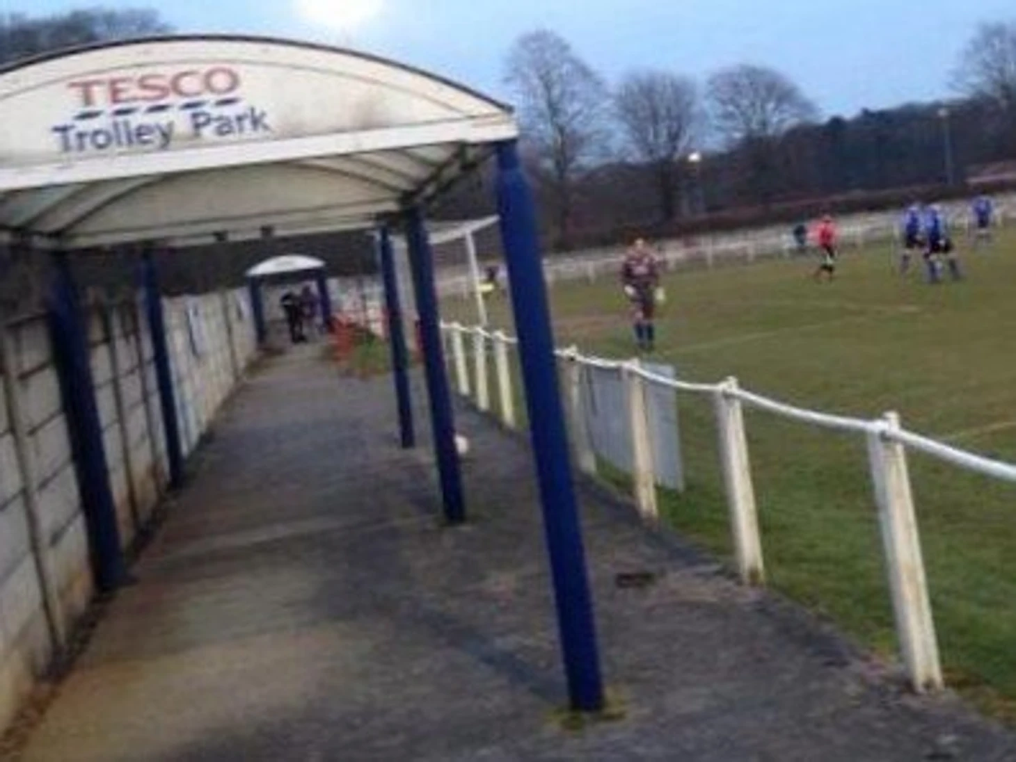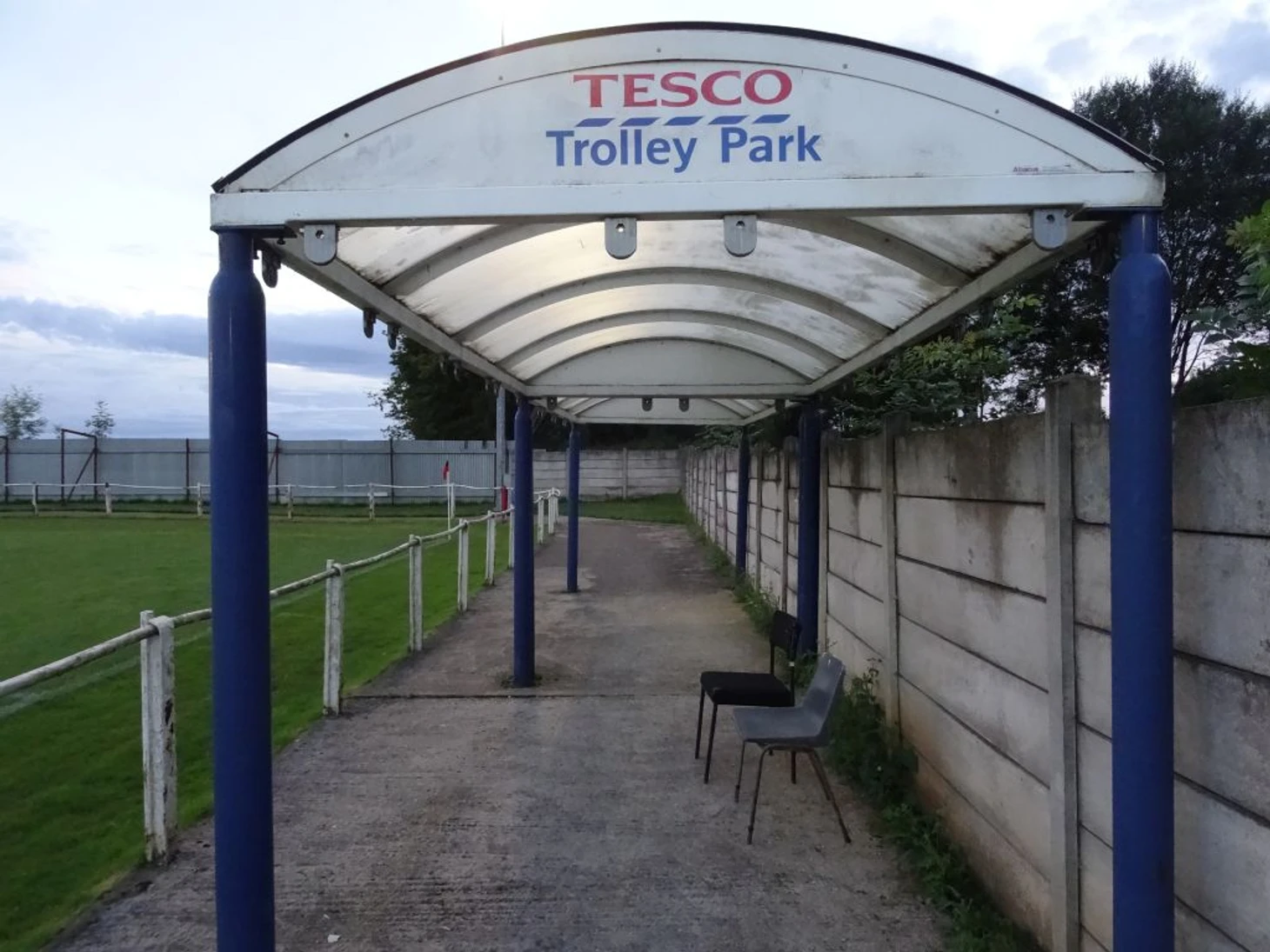 У «Теверсала» – маленький стадиончик. А вот так выглядит на нем гостевая трибуна. Это 2 стоянки для тележек от универмага Tesco.