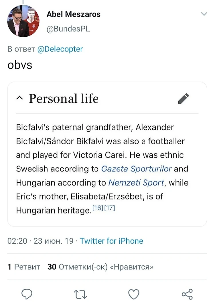 «Очевидно» (дальше вырезка из статьи в википедии про то, что дед Эрика то ли венгр, то ли швед – Sports.ru)