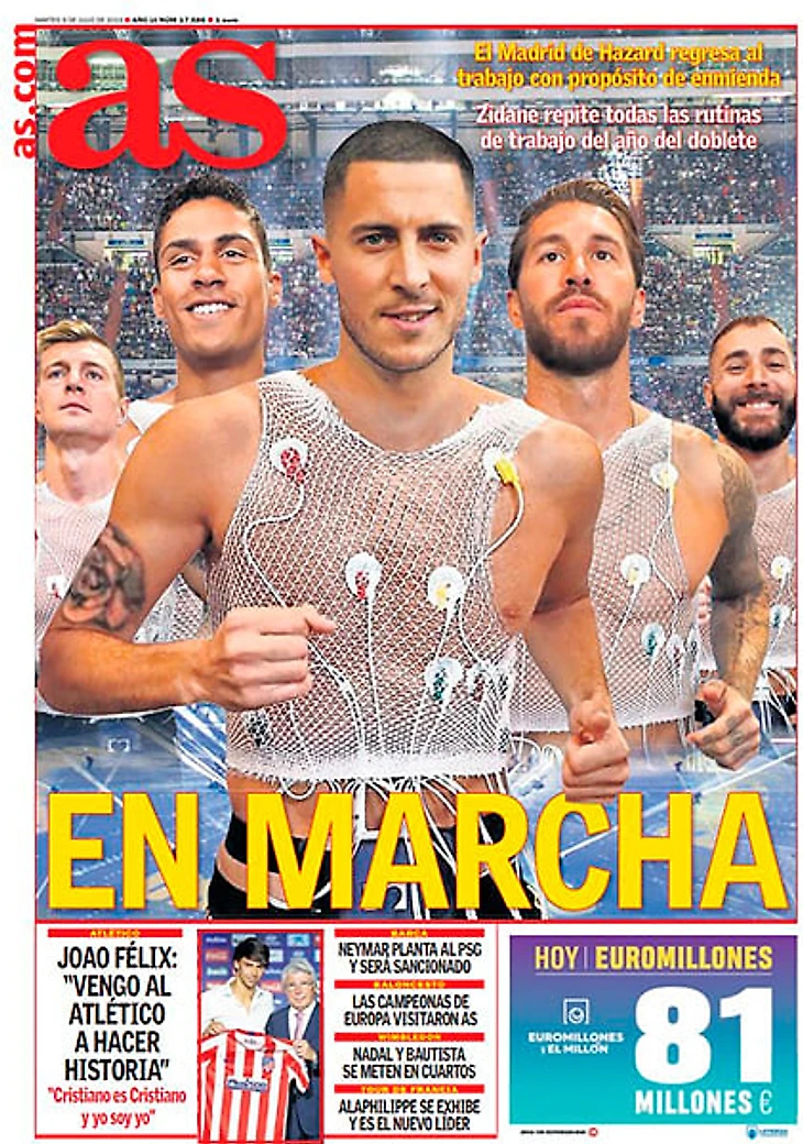 На обложке As за 9 июля – коллаж из фотографий со стандартного медобследования перед предсезонкой. Живот Азара решили не показывать и прифотошопили бельгийцу тело Бензема.