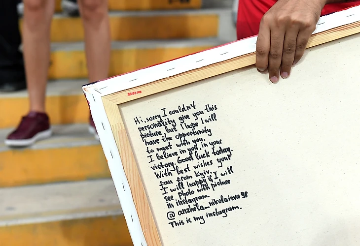 «Привет! К сожалению, я не могу лично отдать тебе картину, но надеюсь когда-нибудь встретиться. Я верю в тебя, в вашу победу. Удачи! С лучшими пожеланиями от фаната из Киева.