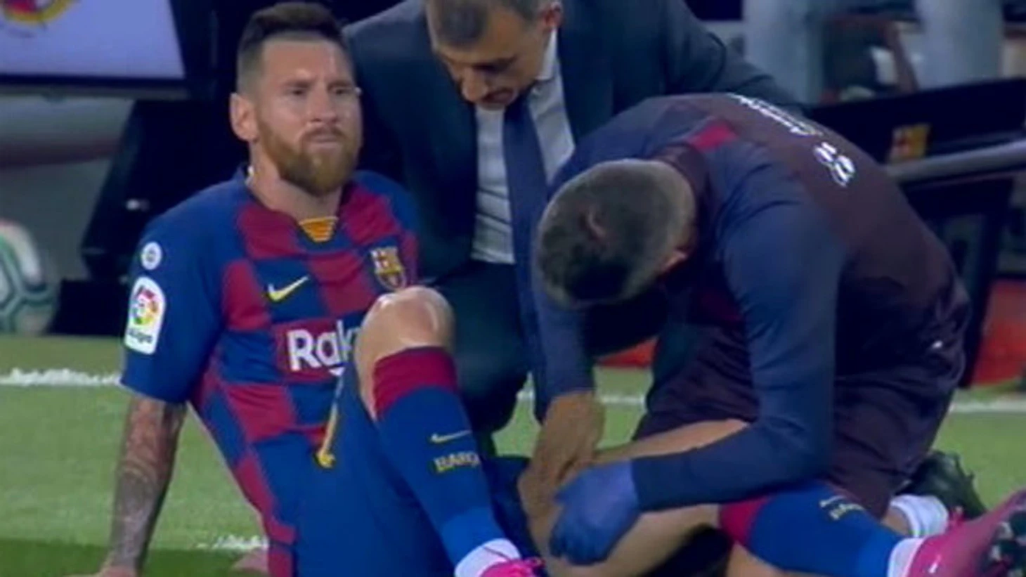 Но в середине тайма что-то пошло не так. Месси почти не участвовал в игре, ходил по полю. Потом собрал вокруг себя четверых игроков, получил по ногам и поковылял к медицинскому персоналу. Лео активно массировали бедро, а на бровке в это время разминался Дембеле.