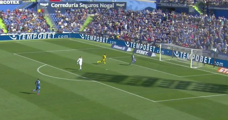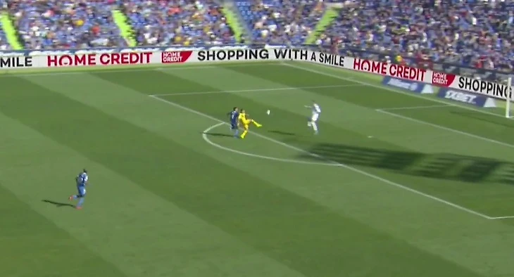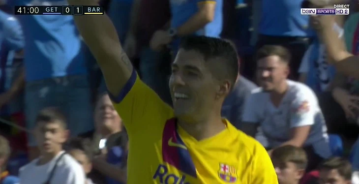 На форварда выбегал вратарь Давид Сория. Обрабатывать не было времени, поэтому Суарес подстроился под отскок и перебросил голкипера.