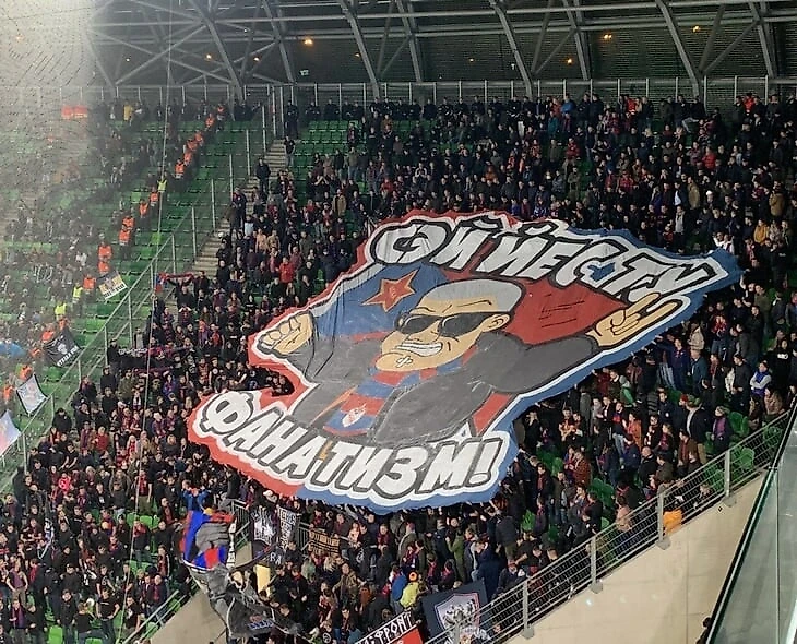 Фанаты ЦСКА, добравшиеся до стадиона, к концу первого тайма растянули баннер с надписью «сэй йес ту фанатаизм».