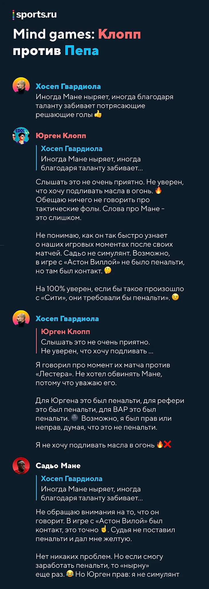 В воскресенье один из самых ожидаемых матчей европейского сезона: «Ливерпуль» на «Энфилде» зарубится с «Манчестер Сити». Разогрев начался на прошлой неделе – после игры «Ливерпуля» с «Астон Виллой», где парни Клоппа горели почти весь матч, но забили два в конце, а победный уложил Садьо Мане в добавленное время (а в первом тайме получил желтую за симуляцию). Первым выступил Пеп.