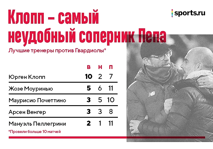 Клопп – с отрывом самый тяжелый соперник Пепа. Из тех, с кем Гвардиола провел 10 матчей, Юргену он проигрывает чаще всего, немец вообще единственный, с кем у него отрицательный баланс.