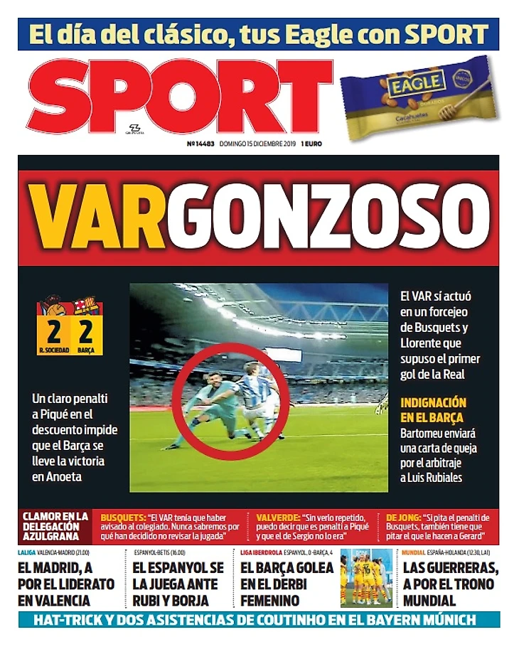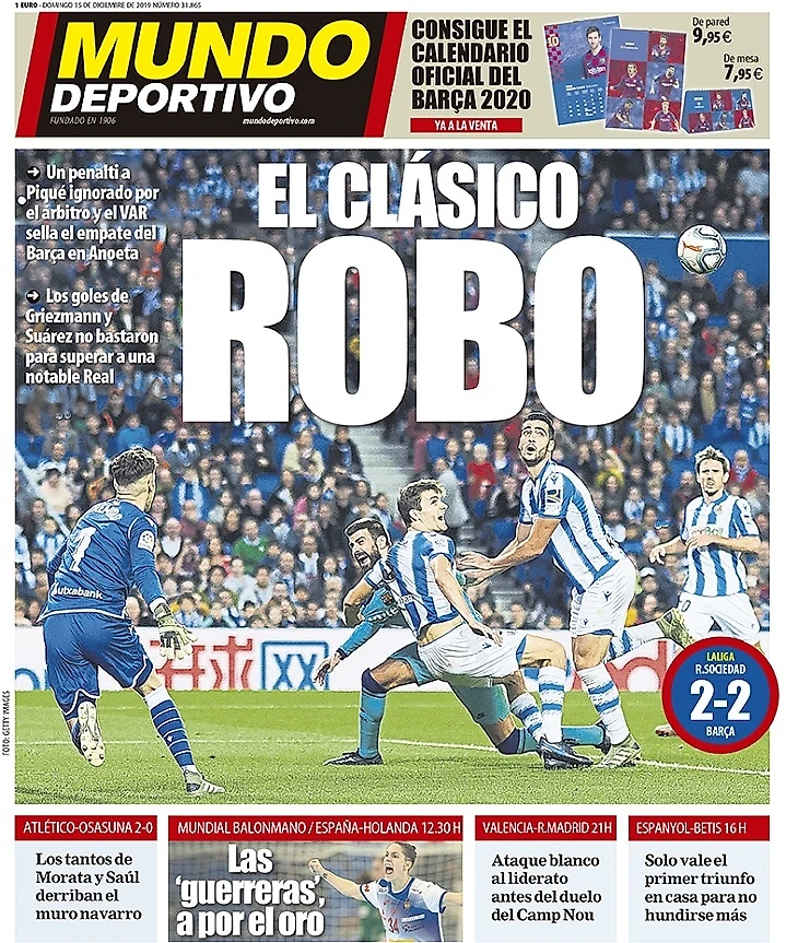 Каталонские газеты сегодня вышли с одинаковыми по смыслу обложками. Mundo Deportivo пишет о классическом ограблении: арбитр проигнорировал эпизод с пенальти Пике.