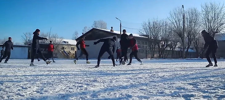 Сразу с самолета Жека поехал на тренировку – в -21 градус. Главный тренер пришел на тренировку в унтах. Играют в обычной клетке на снегу. Главный стадион на зиму заливают в каток. Когда слишком холодно, занятие проходят в зале: его делят с секцией художественной гимнастики.