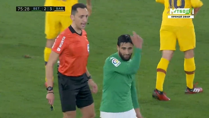 77:12 – Игра возобновилась после того, как судья выслушал игроков «Бетиса» и объяснил решение скамейке севильского клуба.