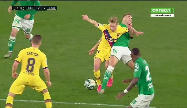 77:26 – Лорен и Де Йонг столкнулись в центре поля. Игрок «Бетиса» пошел в жесткий отбор, за что получил отмашку от голландского полузащитника. Судья зафиксировал фол у футболиста «Барселоны».