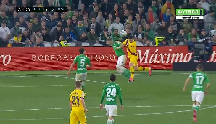 Уже на четвертой минуте Фекир пробил по воротам, Лангле заблокировал удар рукой – судья после просмотра повтора назначил пенальти и дал защитнику «Барсы» желтую карточку. Каналес пенальти реализовал и «Бетис» вышел вперед.