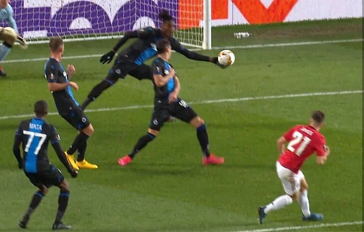 Защитник «Брюгге» отбил мяч рукой перед вратарской в эффектном прыжке. Очевидный фол, но судья пошел смотреть повтор