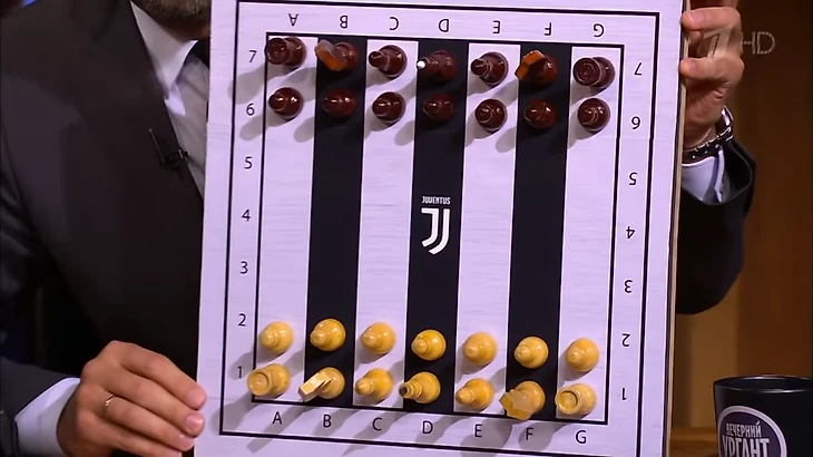 Ургант заметил в инстаграме Дель Пьеро постановочное фото с шахматами, поэтому ему подарили идеальную версию: доска 7х7 в цветах «Ювентуса», клеток нет, фигуры ходят только вперед (но только в теории, потому что они вообще приклеены).