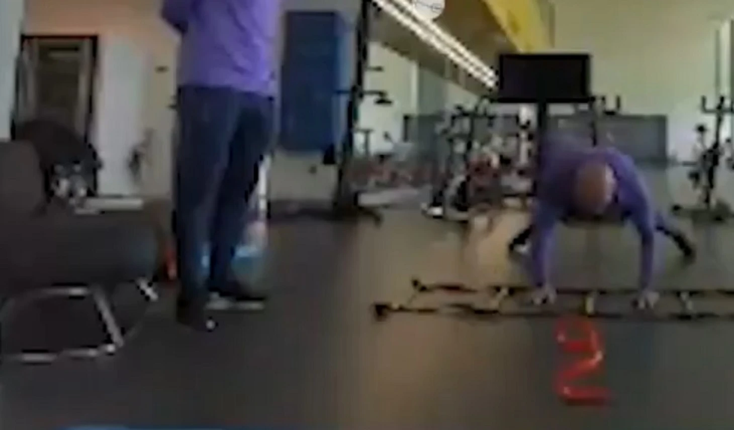 Когда дело дошло до лесенки, футболисты немного поплыли: тренер перебирал руками очень быстро.