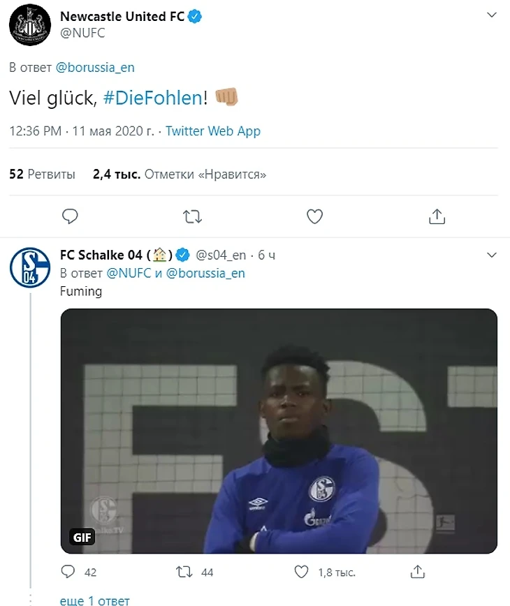 Думаете, это конец твиттер-войны? Нет! «Ньюкасл» пожелал удачи «Гладбаху», а в реплаи пришел негодующий «Шальке».