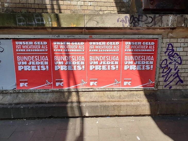 В Кельне фанаты расклеили перед первым матчем плакаты с саркастическим лозунгом «Наши деньги важнее вашего здоровья – Бундеслига любой ценой!».