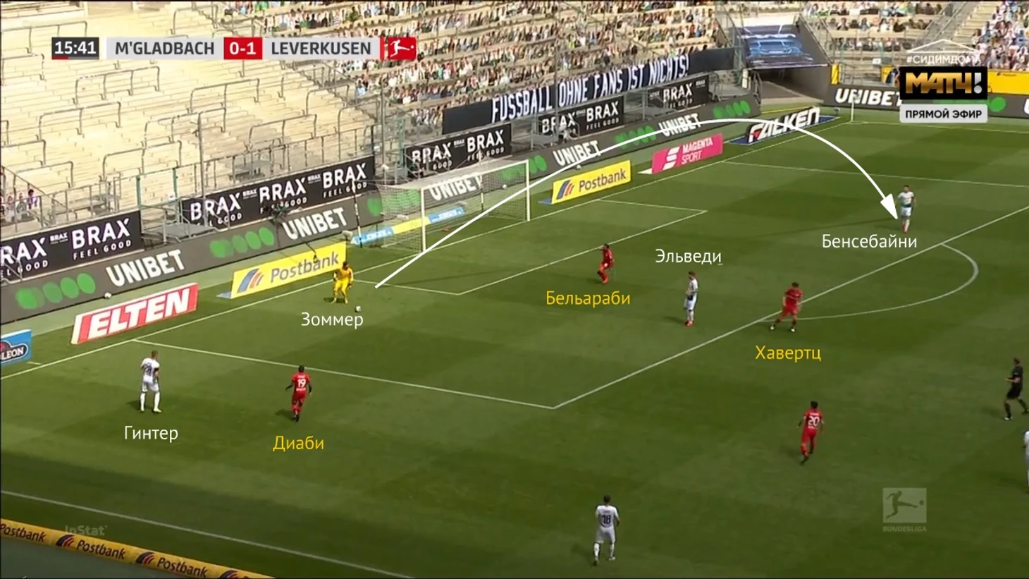 Зоммер в этом матче несколько раз эффектно играл ногами. Его скиллы использовали для прохождения высокого прессинга «Байера» – вот такой пас он отдал на защитника внутри штрафной.