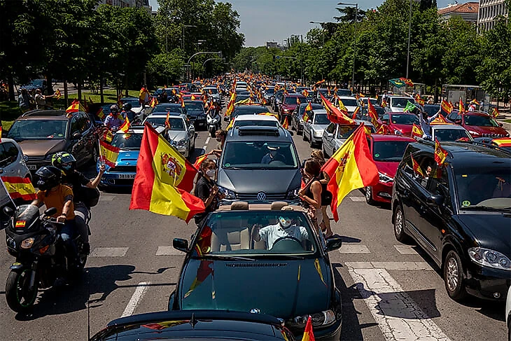 В Мадриде и некоторых других городах Испании в субботу действительно прошли многотысячные автомобильные протесты против карантина (и не только автомобильные – например, на улицы вышли проститутки, потому что не получают никакой поддержки). Митингующие двигались колоннами, шумели, сигналили и перекрывали движение в городах.