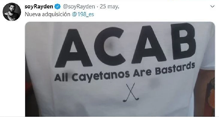 Обычно эта британская аббревиатура используется для критики полиции и означает «Все копы — ублюдки», но в данном случае она адаптирована под испанские протесты. Надпись на футболке рэпера расшифровывается как «Все Cayetanos — ублюдки», а под ней пара клюшек для гольфа.